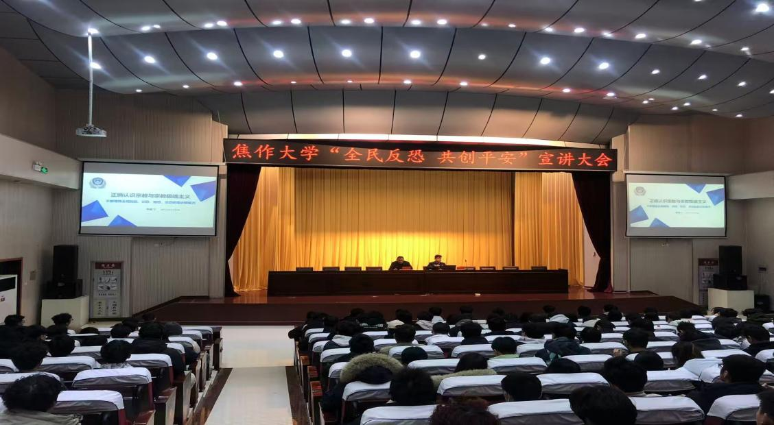 宣讲大会由保卫处处长田庆伟主持,焦作市公安局反恐工作支队政委李欣宁主讲,整个宣讲大会进行了2个半小时,李欣宁政委主要从当前我们国家面临的反恐形势、什么是恐怖主义、我国各种宗教的起源及现状、边疆问题、怎样识别和防范恐怖主义行为等方面为大家详细介绍了当前校园反恐的主要内容。宣讲会上气氛活跃,李政委和大家的互动也赢得了在座同学们的阵阵掌声,这次宣讲不仅给大家上了一堂安全课,也让大家学习到了历史知识,拓宽了视野,使同学们对各种恐怖活动本质有了更深刻的认识,提高了自我保护能力,得到了师生们的普遍认可。